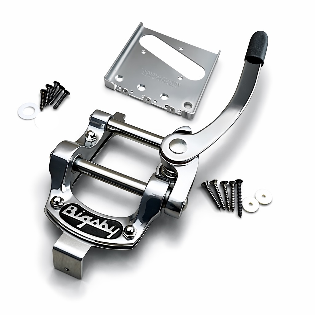 - Vibrato – Bigsby, B5, for flat-top electric guitars, the B5 sometimes referred to as the Bigsby “horseshoe” is designed for flat top solid body guitars. attaching via four screws to a guitar’s top, the B5 is extremely versatile, B5s are common on many styles of guitars including SGs, Les Paul Jrs, Telecasters, and Rickenbacker 325s.