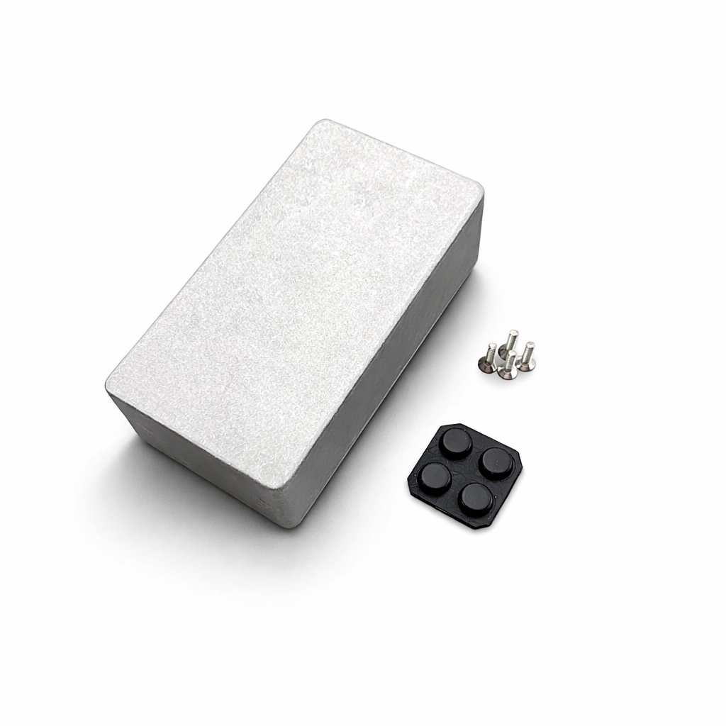 - The product includes a pedal enclosure, four screws, black rubber feet.