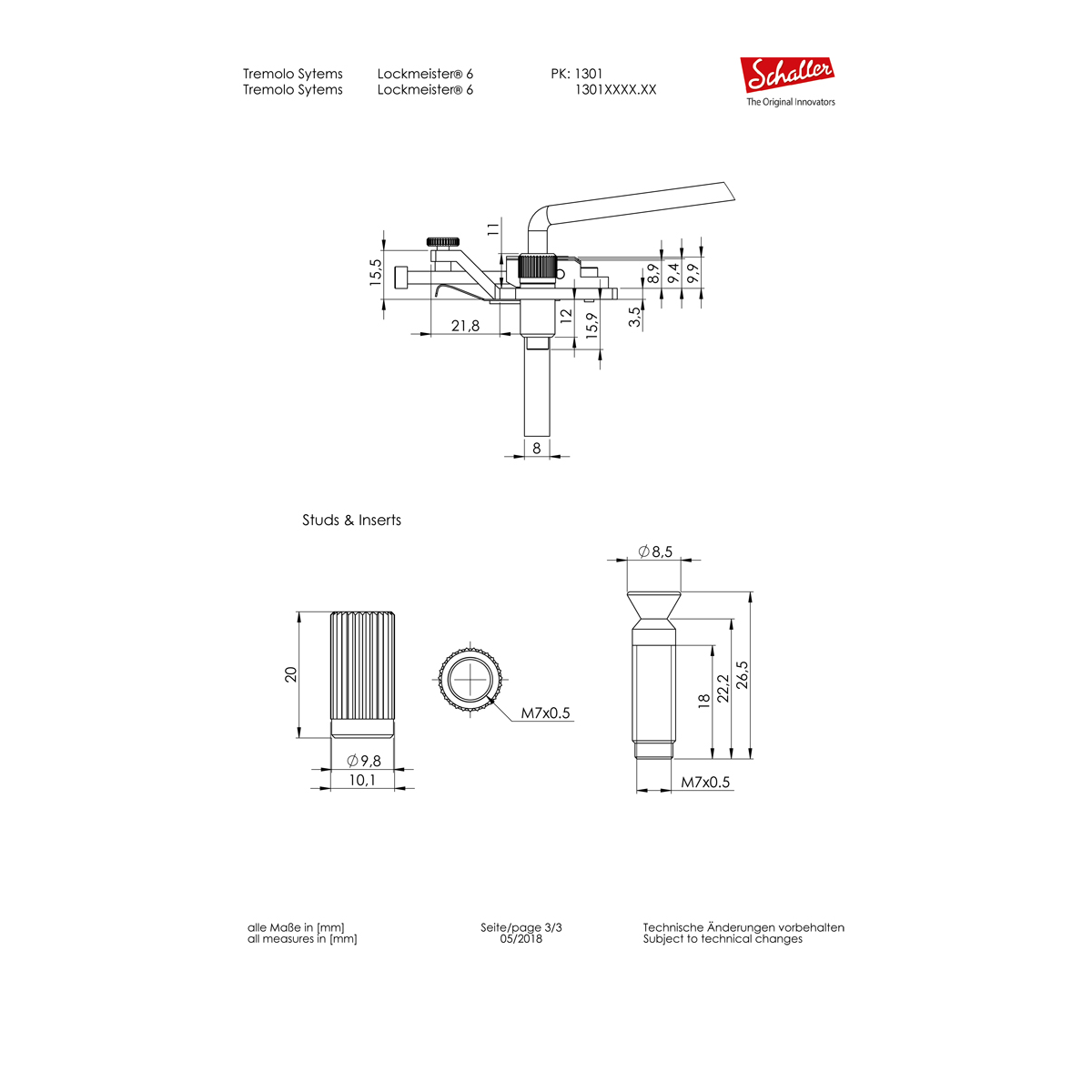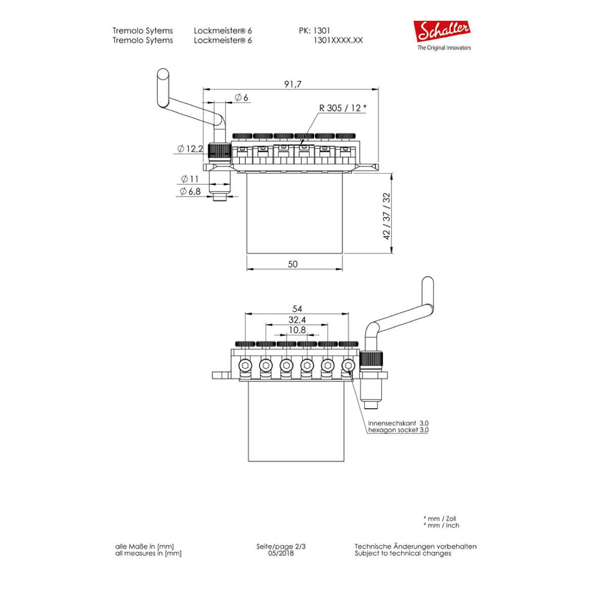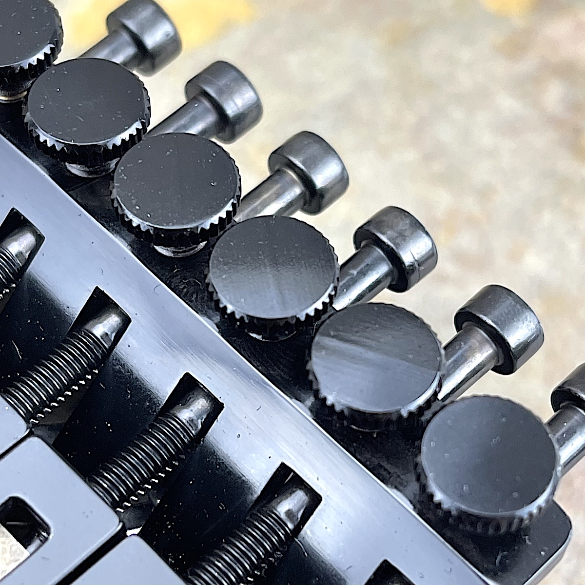The LockMeister™ Tremolo’s C45 steel base plate, hardened and forged in Germany, provides improved tone and sustain while maintaining superior tremolo function and intonation. All LockMeister components are manufactured with incomparably low tolerances, which has a noticeable effect on functionality and long-term quality. Burnished surfaces are prone to corrosion. That‘s why all studs, inserts, and screws of our Schaller LockMeister™ Tremolo feature black zinc and black-chrome finishes for improved look, touch, and durability. Special studs with additional inserts are used to mount the tremolo onto the instrument. The dimensions of our Tremolo LockMeister™ are exactly the same as the dimensions of the Floyd Rose Tremolo. You can easily replace your Floyd Rose Tremolo with ours. This also applies to all replacement parts!