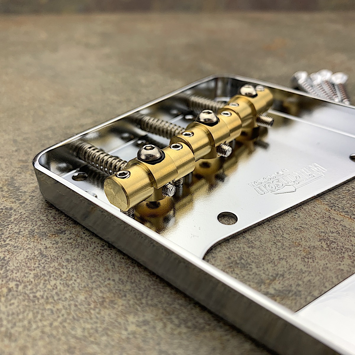 - The brass saddles pivot using a locking center screw to allow any degree of rotation needed to achieve perfect intonation.